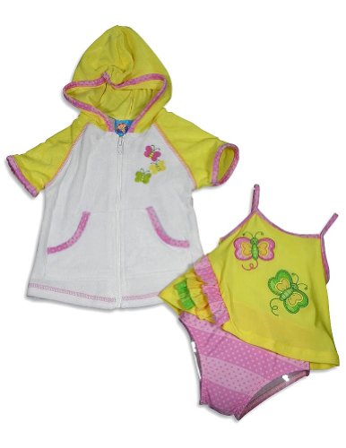 Baby Buns - Newborn Girls One Piece Swimsuit And Coverup, Yellow, Pink, White, Spaghetti Straps With Butterfly Patches, Striped Polka Dot Shoulder Straps And Bottom, Tiered Ruffles, Back Cut Out With Bow, Front Lined, SPF 50, Terry Cloth Hooded Coverup, Zipper Front, Polka Dot Trim, Contrast Stitching, Split Pockets, Swimsuit Shell 85% Polyester 15% Spandex Lining 100% Polyester Coverup 80% Cotton 20% Polyester, #25279